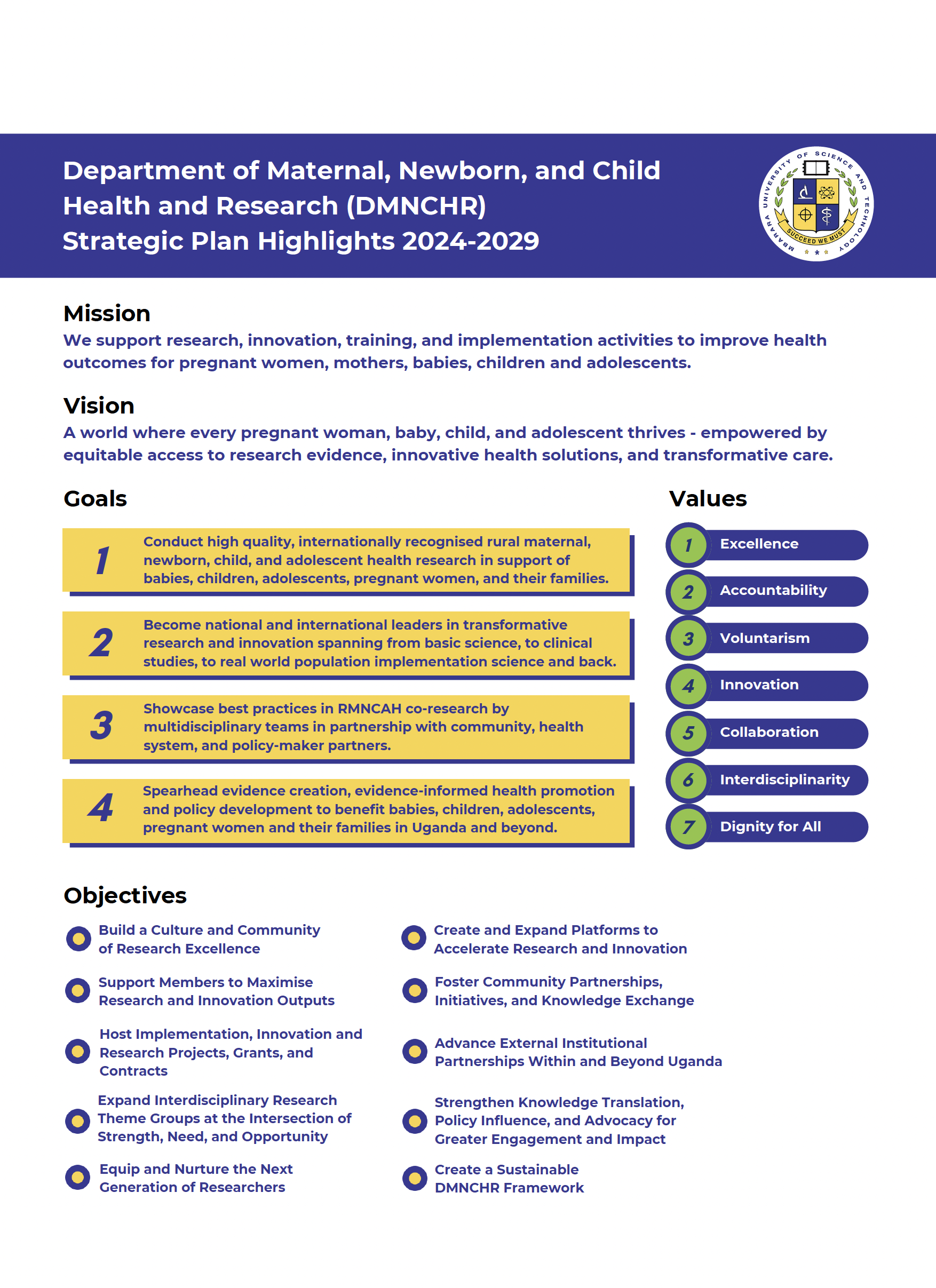 Led by Dr. Hamson Kanyesigye, following in the footsteps of founder Prof. Jerome Kabakyenga, the MNCHR Institute has launched a new strategic direction for 2024–2029 . Under this framework, Healthy Child Uganda continues as a flagship program. The establishment of DMNCHR strengthens the sustainability of HCU activities and partnerships while expanding opportunities for innovative, policy-relevant research, training, and implementation in priority health areas.