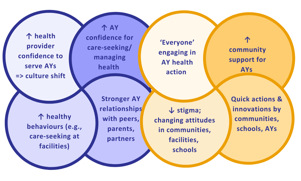 Interviews and Focus Groups with broad stakeholders including AYs revealed significant positive AY health changes. This included decreases in teen pregnancy and sexually transmitted diseases, improved health practices, increased AY care-seeking at government health facilities, improved capacity for AY service provision (skill, confidence, systems), and diverse participant and AY-driven actions and innovations.